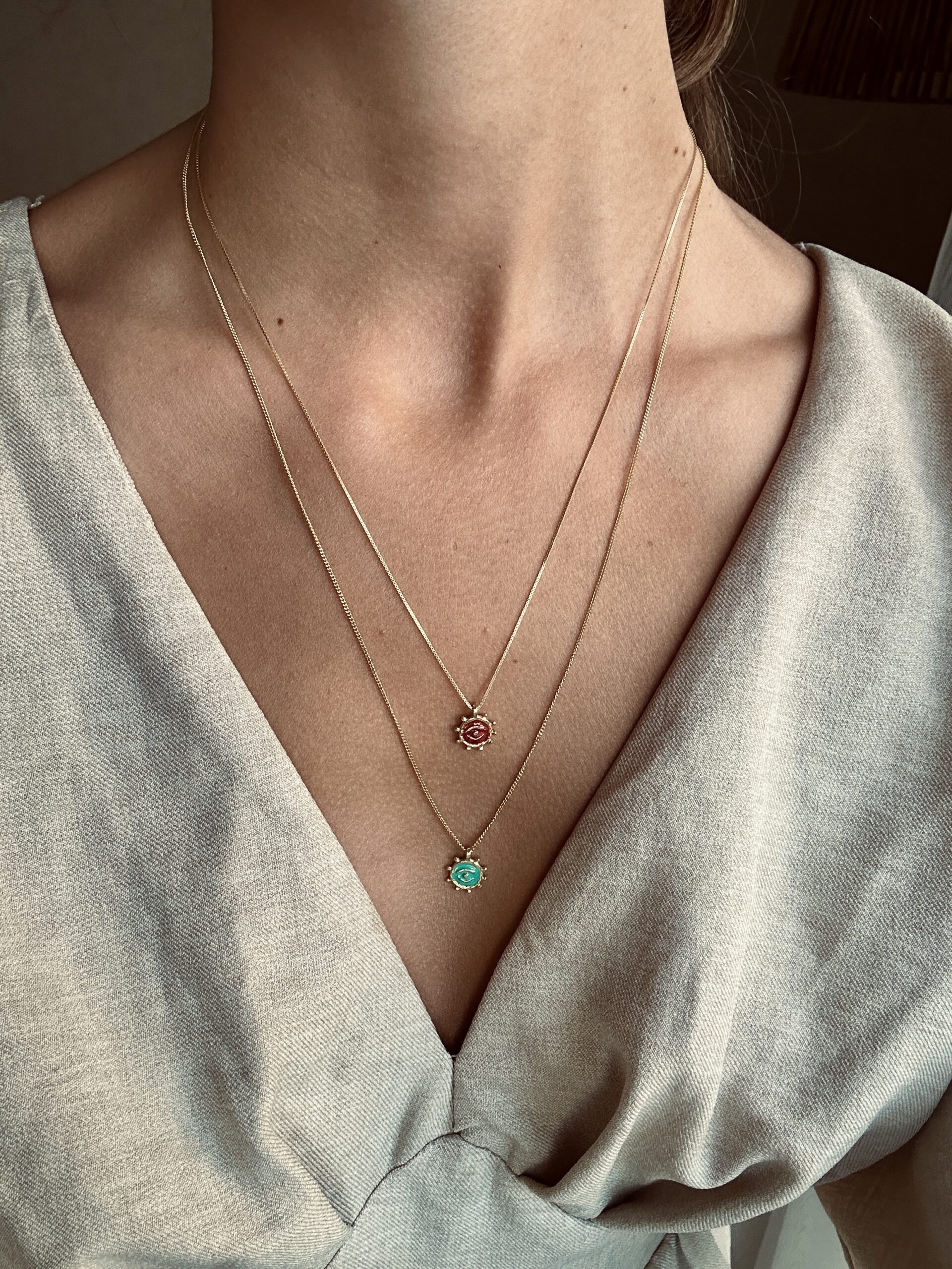 925 ayar gümüş üzeri altın kaplamadır. Renkli kısmı minedir. Zincir boyu; 45+5 cm’dir. Renk seçerek sepete ekleyebilirsiniz.
